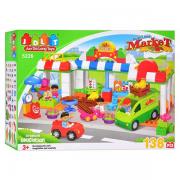Из набора блоков, входящих в состав конструктора JDLT Магазин, можно собрать декорации магазина с различными аксессуарами для покупки и продажи продуктов, а также с фигурками продавцов и покупателей.