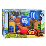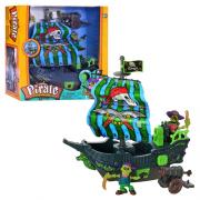 В наборе пиратский корабль с вращающимся вокруг мачты парусом и флагом, 2 фигурки вооруженных пиратов, сундук с сокровищами с открывающейся крышкой. Парус и флаг украшены устрашающим изображением черепа. Корабль оснащен пушкой со световым эффектом.
