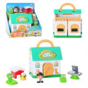 в наборе раскладное здание клиники, медицинский прибор, стол, весы, будка, 3 игровые фигурки (доктор, собака, кошка).