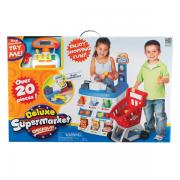 Игровой набор Keenway Супермаркет Delux (31621) состоит из стойки с продуктами, кассы, весов, терминала для кредитной карточки и тележки для продуктов. Кассир считывает товар специальной машинкой, которая пищит и подсвечивается. В набор входят деньги для игры. На табло кассы высвечивается необходимая сумма. В комплекте 20 предметов.