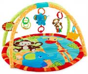 Включает в себя мягкий коврик с изображенными на нем веселыми африканскими зверушками, две дуги для подвешивания игрушек, соединительные кольца и 5 игрушек: