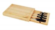 Эргономичные ручки с пластиковыми накладками и 3 заклепками Лезвия заточены вручную и долго сохраняют режущие свойства Доска из дуба с ящичком и магнитной планкой