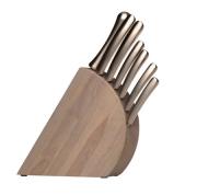 Лезвие заточено вручную и имеет штамп качества. Легко затачиваемые. Стильная деревянная колода (из нетропического дерева) с нескользящей устойчивой платформой. Эргономические ручки для безопасной и прочной хватки.