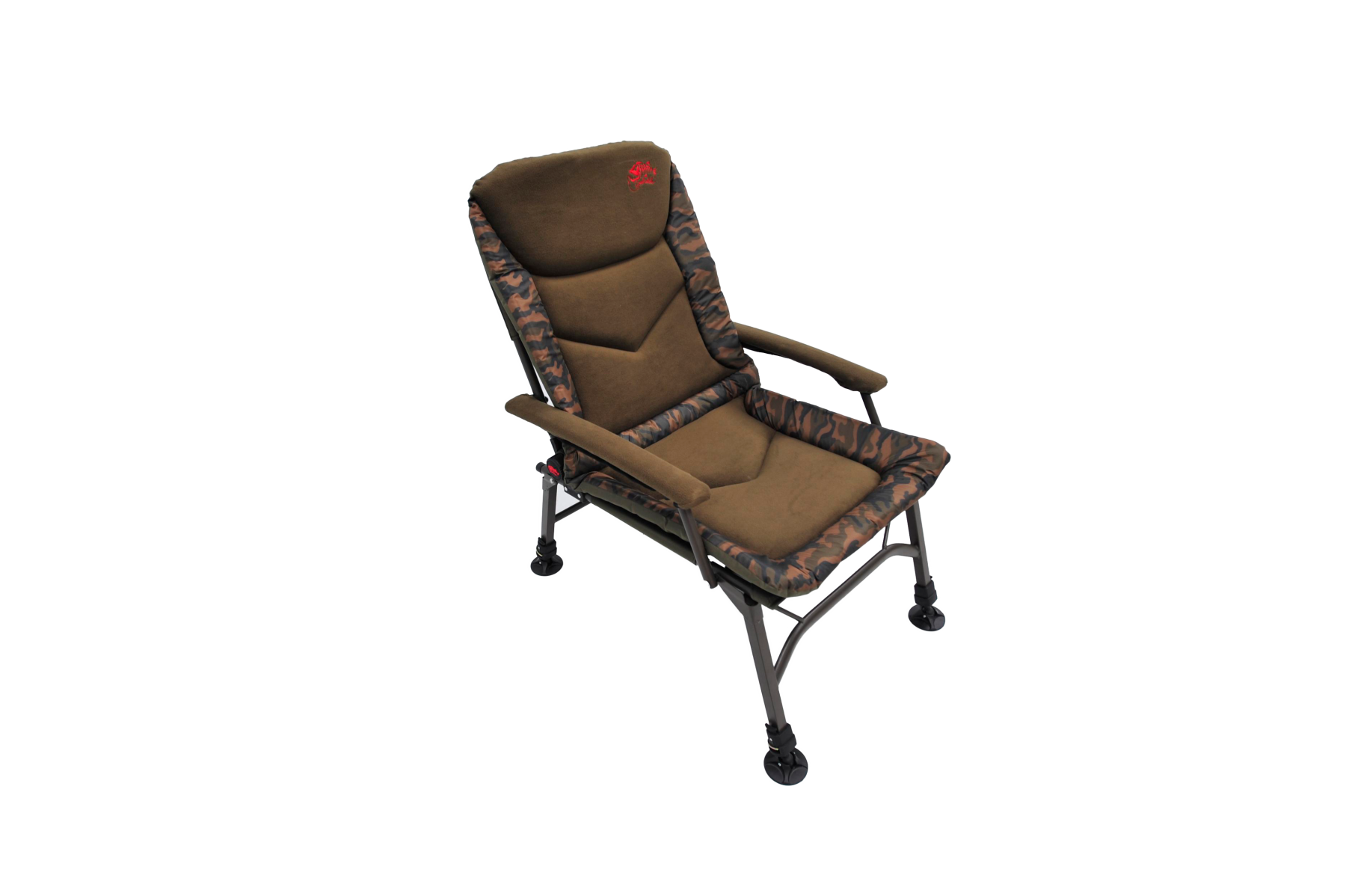 Комфортабельное кемпинговое кресло с сидением и спинкой увеличенной площади . Камуфлированная ткань сидения и съемные чехлы на подлокотники из микрофлиса, угол наклона спинки и телескопические ножки регулируются.