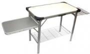 Изготовлен из стальных прямоугольных трубок 40х20мм с порошковым напылением. Верхняя крышка стола изготовлена из МДФ. Кухонный стол с боковой полкой и боковым дополнительным столиком. Складывается до компактных размеров для удобной транспортировки. Размеры: 145х52х63/178,5см. Вес: 11,5кг. Допустимая нагрузка: 50кг. Размер упаковки: 94,5х52х13см.