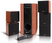 Система объемного звука с активным сабвуфером и деревянными сателлитами. Идеальный комплект для помещений до 20м. Оснащен специальными широкополосными динамиками, что позволяет использовать комплект для прослушивания дорожек Dolby Digital, DTS и стерео записей. Многофункциональное ДУ позволяет регулировать мощность всей системы, отдельно мощность каждого канала, включение и выключение процессора объемного звучания 3D Surround для обработки стерео сигнала, регулировать высокие и низкие частоты, переключать аудио вход. Комплект идеален для прослушивания саундтрэков к кинофильмам, прослушивания музыки и озвучивания звуковых эффектов к играм.