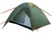 Трехместная однослойная палатка для несложных походов. Каркас на двух дугах (полусфера), противомоскитная сетка, небольшой откидывающийся козырек на выносных стойках, ветрозащитные боковины, вентиляционный клапан.