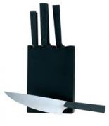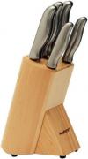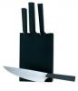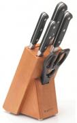 Эргономичные ручки обеспечивают безопасность и удобство работы. Ручки изготовлены из безвредного материала (фенол-альдегидного полимера). Традиционная заточка лезвий вручную. Стильная деревянная колода (из нетропического дерева) с нескользящей устойчивой платформой.