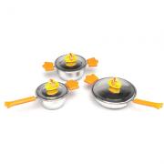 Посуда: 18/10 нержавеющая сталь, полированная поверхность, 3-слойное капсульное дно, ручки из полипропилена (ПП) оранжевого цвета. Подходит для всех типов плит. Подходит для посудомоечной машины.