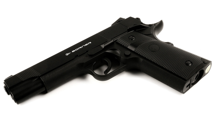 невматический пистолет Borner Predator Elite имеет множество общих черт с легендарным Colt M1911, который использовался вооруженными силами США с 1911 по 1985 годы и все еще применяется в некоторых странах мира. Borner Predator Elite полностью изготовлен из металлического сплава. Корпус и затвор черного цвета, а рукоять оснащена накладками из прочного АБС-пластика, благодаря чему пистолет имеет такие же размеры, как и оригинал. Спусковой механизм этого пистолета работает по принципу DAO (только двойного действия), что означает, что при нажатии на спусковой крючок взводятся и курок, и ударный механизм. Пистолет оснащен системой BlowBack, которая делает стрельбу более реалистичной и одновременно взводит оружие после выстрела, подготавливая его к следующему выстрелу. Для работы пистолета используются стандартные 12-граммовые баллоны с CO2, которые вставляются в рукоять. В нижней части рукоятки находится утопленный нажимной винт, не нарушающий внешний вид пистолета. Один такой баллон позволяет сделать до 60 выстрелов. Ствол пистолета Borner 1911 гладкий, и для стрельбы используются стальные шарики BB калибра 4,5 мм. Магазин вмещает 18 шариков. Предохранитель от случайного выстрела расположен на правой стороне рамки и представляет собой рычаг, который можно перемещать вверх и вниз между отметками F и S. Пневматический пистолет Borner Predator Elite идеально подходит для тренировок в обращении с оружием и для любительской стрельбы. Тип пневматики СО2; Калибр 4,5 мм; Ударно-спусковой механизм (УСМ) двойного действия; Общая длина 225 мм; Ствол гладкий; Материал затвора/рамы металл; Материал рукояти пластик; Материал корпуса металл; Вместимость магазина 18 шт; Начальная скорость 120 м/с; Прицельные приспособления регулируемый целик и мушка; Blowback есть; Предохранитель ручной; Вес 680 г; Комплектация пистолет, упаковка, шестигранный ключ, паспорт.
