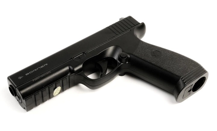 Пневматичний Borner має монолітний пластиковий корпус. Завдяки зниженню кількості рухомих вузлів виробник поліпшив купчастість і швидкість зброї - пістолет видає 120 метрів за секунду.