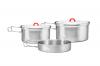 Набір посуду з нержавіючої сталі для 2-3 осіб (М) , складається з двох казанків з кришками та сковорідки. Набір упакований в зручний сітчатий чохол. Посуд виготовлений з нержавіючої сталі 18/8 товщиною 0,5мм, яка добре прогрівається та дозволяє використовувати посуд на відкритому вогні.