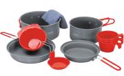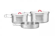 Набор посуды из анодированного алюминия для 2-3 человек, состоит из двух котелков, двух крышек-сковородок. В набор также входят комплект из мисок и чашек для трех человек, черпак и тряпка для мытья посуды. Набор упакован в удобный сетчатый чехол.