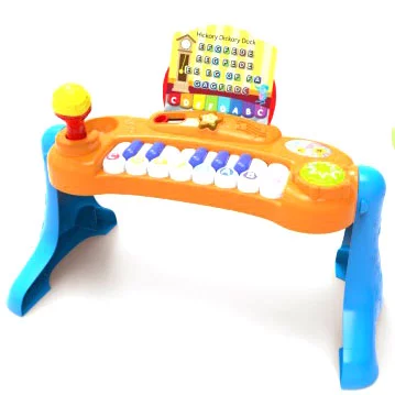 Яркое пианино на подставке с 8 клавишами. Оснащено пятью двухсторонними музыкальными картами, кнопкой с подсветкой для проигрывания демо – песен. Есть съемная гитара с разноцветными шариками внутри и микрофон с регулируемым положением. Маленькая студия может воспроизводить звуки гитары, трубы и барабана.