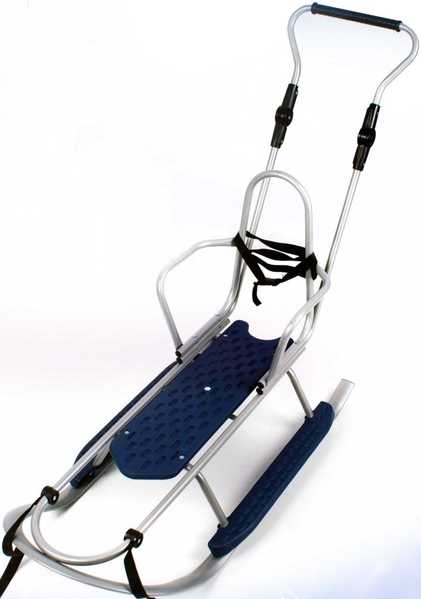 Санки с плоскими полозьями. Имеют оригинальный внешний вид. Оснащены съёмной спинкой и регулируемой ручкой.