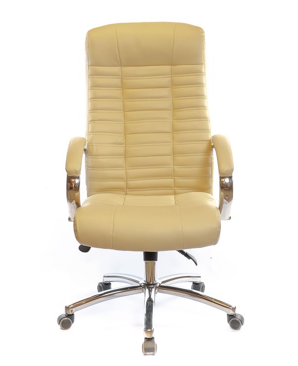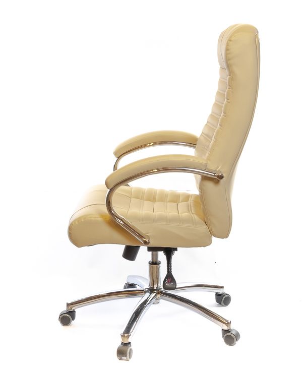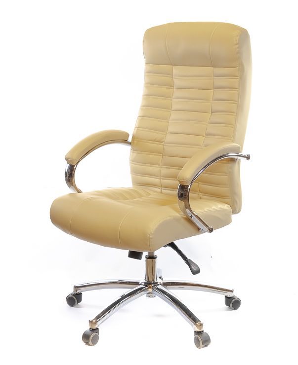 Крестовина кресла изготовлена из хромированного металла, который обеспечивает ему необходимую прочность и устойчивость. Хромированные элементы не потеряют свою красоту со временем, ведь покрытие очень прочное и стойкое к всевозможным внешним факторам. Мобильность такому габаритному креслу обеспечивают роликовые опоры. В данной модели используются универсальные прорезиненные ролики, которые подойдут для всех типов напольного покрытия. Модель имеет большие габариты, высокую спинку, глубокую и широкую посадку, а значит отлично подойдёт для людей и высокого, и среднего роста. Посадка достаточно удобная, сидение большое и мягкое. В основе сидения используется гнутоклееная фанера с поролоновым наполнением под обивкой. Углубление по центру сидения и скошенный передний край уберегут сосуды ног от пережимания, а ноги от накопления усталости к концу рабочего дня. Данная модель очень популярна и имеет несколько модификаций от недорогих с пластиковыми деталями до роскошных в коже и дереве.