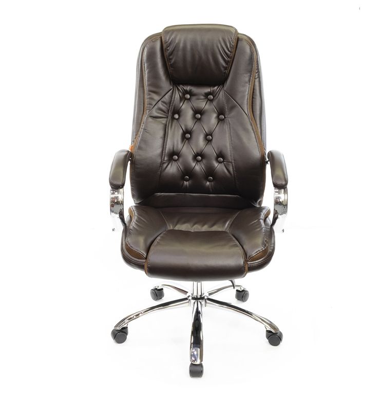 Крестовина данного кресла изготовлена из металла. Блестящее хромированное покрытие металла не только красивое, но и очень прочное. Такая крестовина очень прочная и может выдерживать нагрузку до 120 кг. Она не поддаётся механическим повреждениям, героически выдерживая постоянный контакт и с тяжёлой мужской обувью и со шпильками любимых туфель офисных модниц. Ролики обеспечат креслу необходимую мобильность. Для данной модели отлично подойдут ролики с хромированными накладками, которые по желанию можно заказать дополнительно. Спинка кресла достаточно высокая, хорошо подойдёт для человека выше среднего и высокого роста. Благодаря форме деревянного каркаса, мягкому наполнителю и дополнительным накладным подушкам на сидении и спинке вам обеспечена боковая и поясничная поддержка позвоночника, что снимает излишнюю нагрузку. Это поможет сохранить отличное самочувствие на протяжении всего пребывания в кресле. За счёт этого вы получаете комфортное рабочее место, в котором вам хочется задержаться подольше.