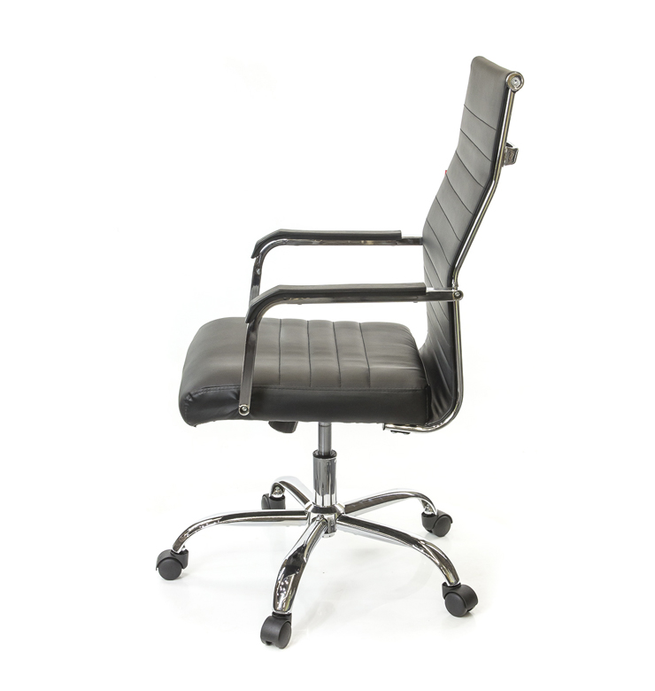У данной модели оригинальные подлокотники из металла, которые крепятся к основной раме сбоку болтовыми соединениями. Для большего удобства подлокотники оснащены чехлами из черного пластика, которые уберегут ваши руки от контакта с холодным металлом. Высота подлокотников подобрана таким образом, чтобы в нижнем положении сидения кресло можно было задвинуть под рабочий стол и освободить пространство возле стола. Крестовина кресла Кап FX изготовлена из металла. Такая крестовина очень прочная и может выдерживать нагрузку до 150 кг. Блестящее хромированное покрытие металла не только красивое, но и очень прочное. Оно не боится интенсивных нагрузок и не подвержено царапанию. Ролики обеспечат креслу необходимую мобильность. Для данной модели отлично подойдут ролики с хромированными накладками, которые по желанию можно заказать дополнительно. Эргономика конструкции – еще один плюс данной модели. Каркас кресла их металлической трубы имеет небольшой прогиб в поясничной области, что обеспечивает правильную поддержку позвоночника. Кресло в меру жесткое, а значит, будет беречь вашу спину от усталости и сохранит правильную осанку. Металлическая поперечная планка на спинке кресла - это не только элементы декора. Она увеличивает жесткость конструкции, а также ее можно использовать как удобную ручку для перемещения кресла. В сидении использован мягкий наполнитель из мебельного поролона, который отлично держит форму и не просаживается со временем.