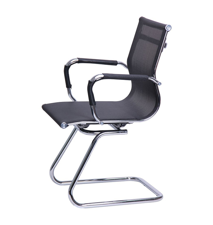 П-образный каркас выгнутый из цельной металлической трубы диаметром 20 мм, его конструкция достаточно прочная и устойчивая. Хромированные элементы, как зеркала, позволяют увидеть силуэты интерьера и не потеряют свою красоту со временем, ведь покрытие очень прочное и стойкое ко всевозможным внешним факторам. Форма основания позволяет креслу немного пружинить, создавая эффект лёгкого покачивания. Для защиты напольного покрытия в кресле использованы пластиковые заглушки. Пластиковые заглушки в основании рамы защищают пол от царапин и повреждений. Эргономичная спинка средней высоты из металлической трубы имеет прогиб в поясничной области, который обеспечивает вашей спине комфортную поддержку, а вам хорошее самочувствие даже в конце насыщенного рабочего дня. В месте изгиба труба каркаса дополнительно армирована, что увеличивает её прочность Посадка умеренно жёсткая, что хорошо для сохранения правильной осанки. Для большей прочности в сидении использован дополнительный слой обивки для увеличения прочности и для защиты от проседания сетки.