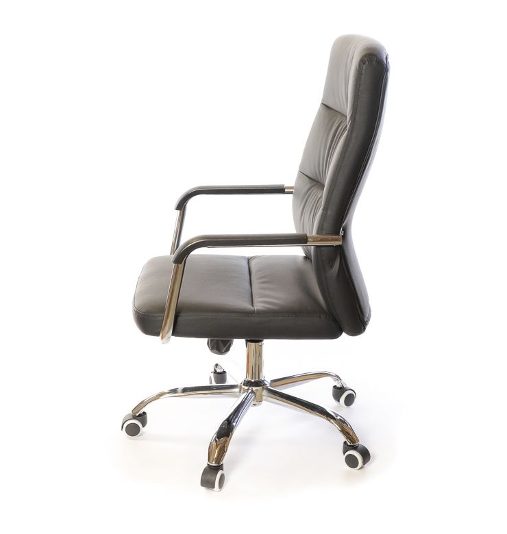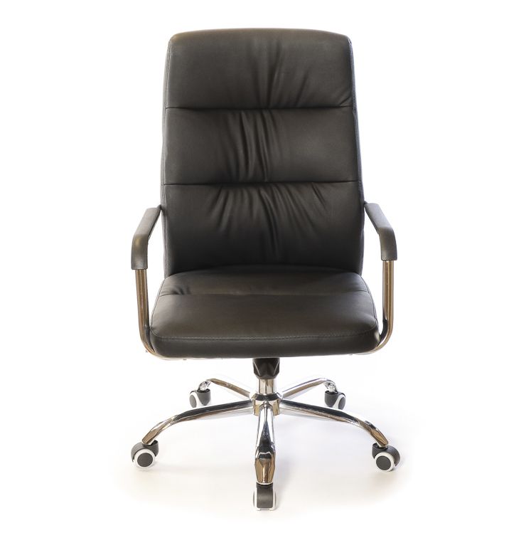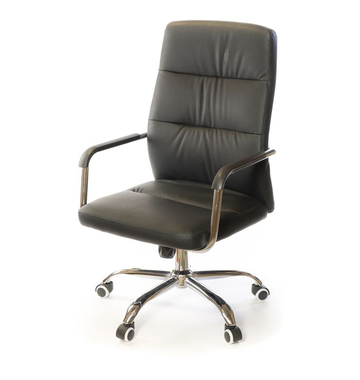 Подлокотники изготовлены из хромированной трубы, которая плавно переходит в каркас кресла. Такая конструкция достаточно жесткая, прочная и надежная. Дополненный накладками из черного пластика блестящий металл прекрасно подчеркивает внешнюю красоту кресла. Хромированное покрытие очень стойкое. Оно не царапается, а значит, надолго сохранит красоту кресла. Металлическая крестовина, которая стоит на данном кресле, отлично выдерживает нагрузку до 120 кг. Лучи крестовины имеют изогнутую форму, что формирует элегантный силуэт кресла. Кресло легко передвигается благодаря роликовым опорам. Кресло оснащено универсальными прорезиненными роликами, которые подойдут для всех типов напольных покрытий. Кресло средних размеров, с мягкой посадкой. Высота спинки ниже, чем у полноразмерной модификации на крестовине, но во всем остальном кресло такое же комфортное. Монолитное деревянное основание спинки имеет эргономичный прогиб в поясничной области, что обеспечит вашей спине комфортную поддержку и снимет нагрузку с позвоночника. Передняя часть сидения имеет скошенный край, чтобы не пережимались сосуды ног, а значит, ногам было более комфортно во время длительного нахождения на одном месте.