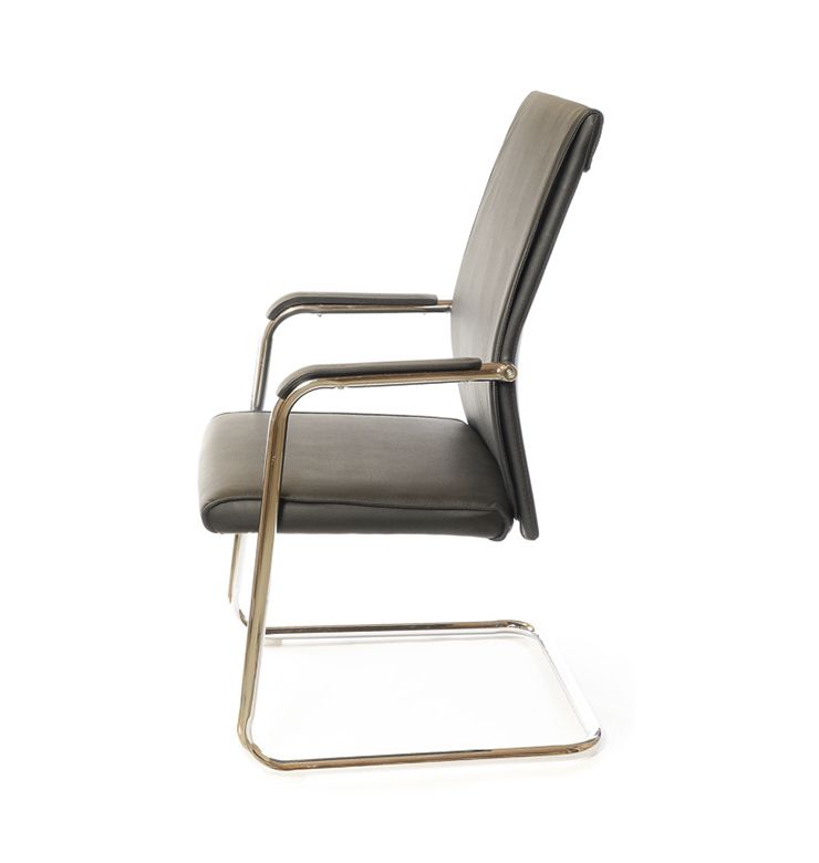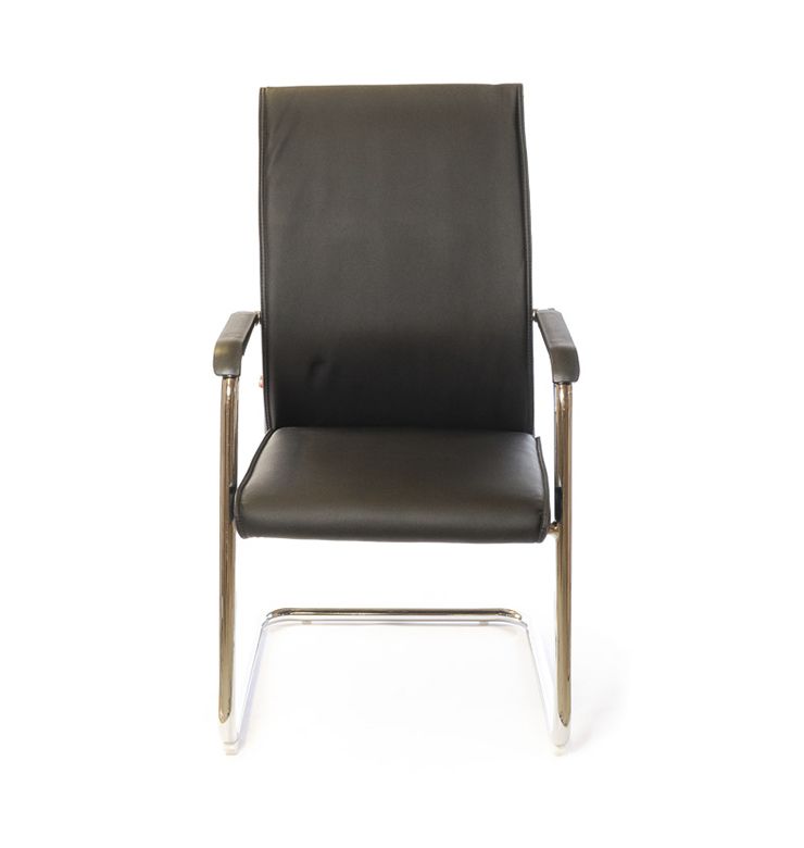 Металлические подлокотники - это часть каркаса кресла, перетекающая в основание, оснащены пластиковыми накладками. Хромированное покрытие металлических деталей кресла достаточно стойкое, не царапается и надолго сохраняет привлекательный внешний вид. Высота подлокотников позволяет пододвинуть кресло вплотную к рабочему столу стандартной высоты и освободить окружающее пространство рядом. П-образное основание данной модели изготовлено из цельной металлической трубы. Такое основание достаточно прочное, устойчивое и рассчитано на нагрузку до 100 кг. Поверхность не боится больших нагрузок, царапин и сколов благодаря стойкому хромированному покрытию. Форма основания позволяет креслу немного пружинить, создавая эффект лёгкого покачивания. Для защиты напольного покрытия в основании используются пластиковые заглушки. Спинка кресла средней высоты, подойдёт людям невысокого и среднего роста. Прогиб в поясничной области придаёт креслу необходимую эргономичность и благотворно повлияет на ваше самочувствие, особенно в конце рабочего дня - спина будет меньше уставать. Кресло достаточно мягкое благодаря толстому слою поролона в сидении и спинке, этим объясняется его необычайное удобство для большинства людей. Эту модель часто покупают в комплекте с креслом на крестовине из этой же серии, для обустройства офиса в едином стиле.