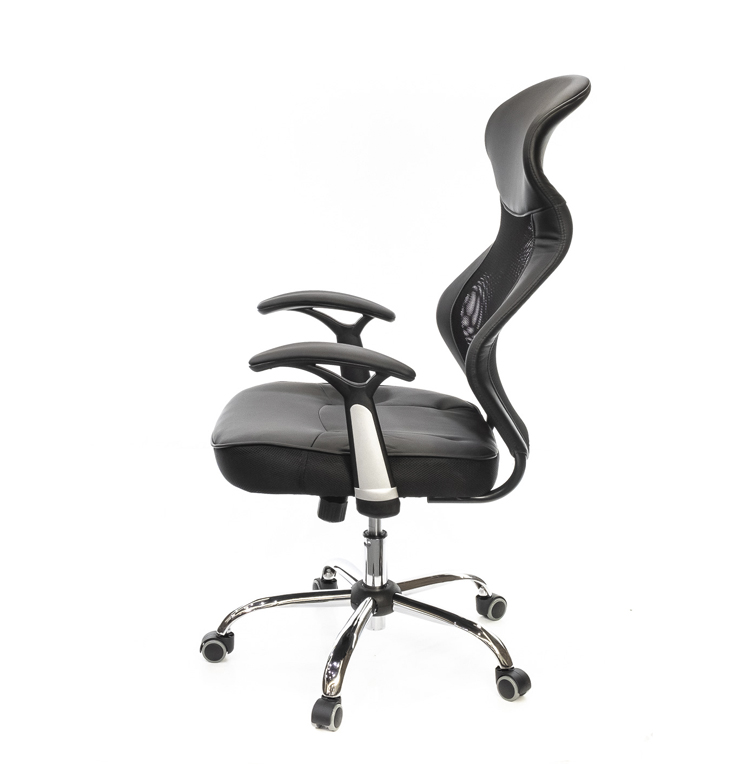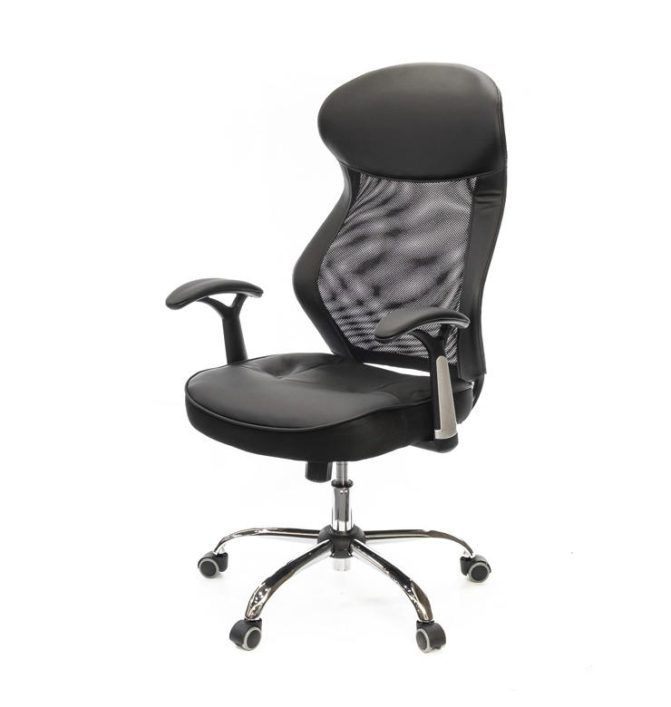 У данной модели стильные Т-образные подлокотники из чёрного пластика. Мягкие накладки обеспечат вашим рукам надежную и комфортную опору, уберегут их от контакта с твердым пластиком. Крестовина кресла Терция изготовлена из хромированного металла. Она цельнолитая, что увеличивает ее прочность и дает возможность может выдерживать нагрузку до 120 кг. Блестящее хромированное покрытие металла не только красивое, но и очень прочное. Оно не боится интенсивных нагрузок и не подвержено царапанию. Ролики обеспечат креслу необходимую мобильность. В данной модели они прорезиненные и подойдут для всех типов покрытий. Для данной модели также можно приобрести ролики с хромированными накладками, которые более гармонично будут смотреться с блестящей металлической крестовиной. Высокая эргономичная спинка имеет прогиб в поясничной области, который обеспечит вашей спине комфортную опору, а вам хорошее самочувствие даже в конце насыщенного рабочего дня. Боковая поддержка, сформированная каркасом, поможет обегать позвоночник и сохранит правильную осанку. В сидении кресла используется прочное основание из гнутоклееной фанеры, которое совместно с поролоновым наполнением формируют удобную посадку. Широкий интегрированный подголовник снимет излишнюю нагрузку с шеи и даёт возможность максимально отдохнуть всему тела. Сидение имеет специальное углубление в центре и скошенный передний край для удобства посадки и защиты сосудов ног от пережимания. По периметру сидения также используется сетчатый акрил, что увеличивает вентиляционные свойства сидения.