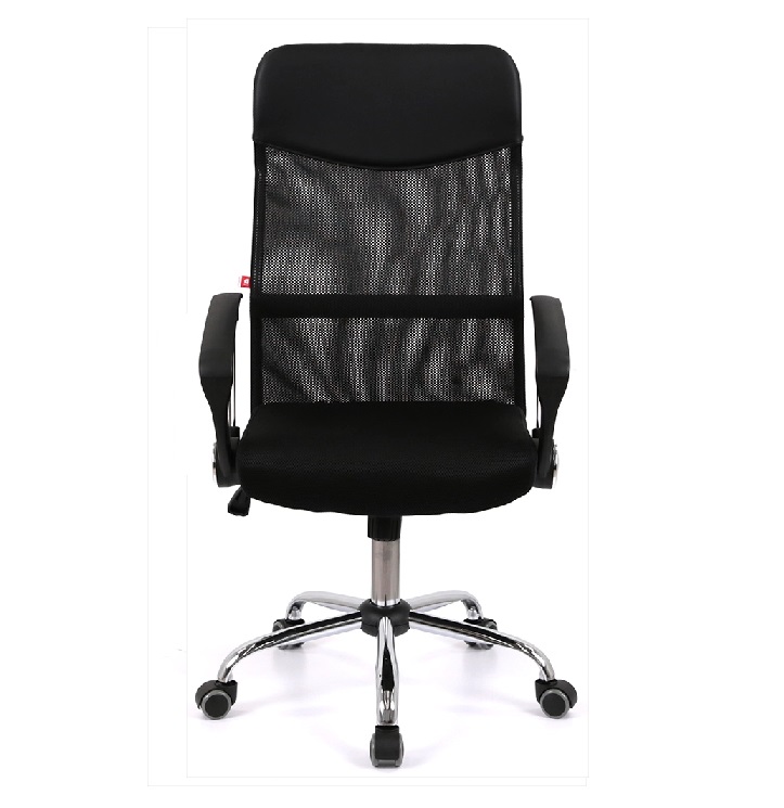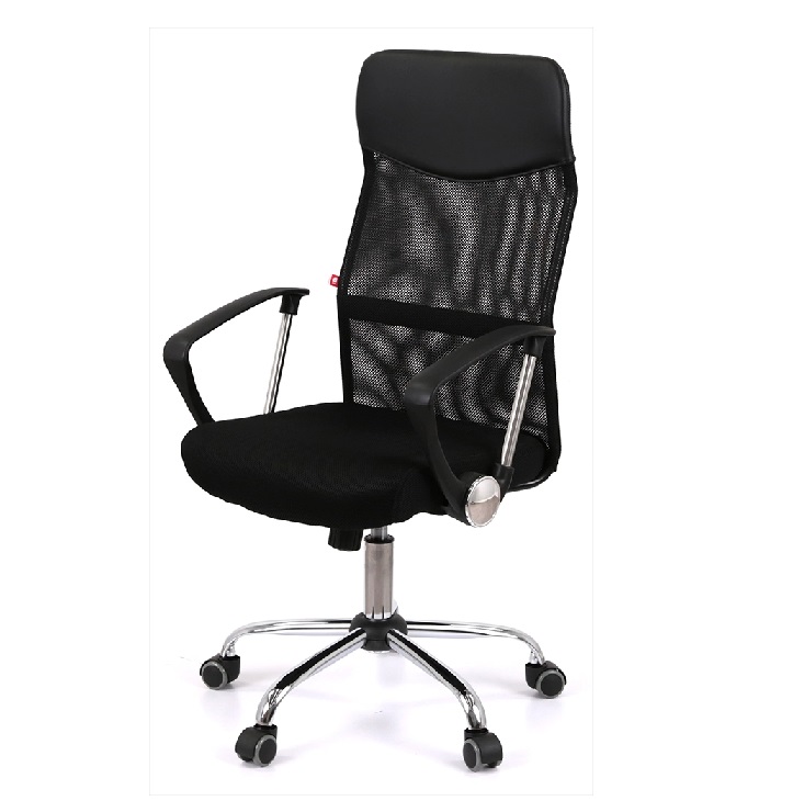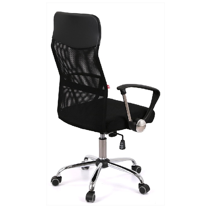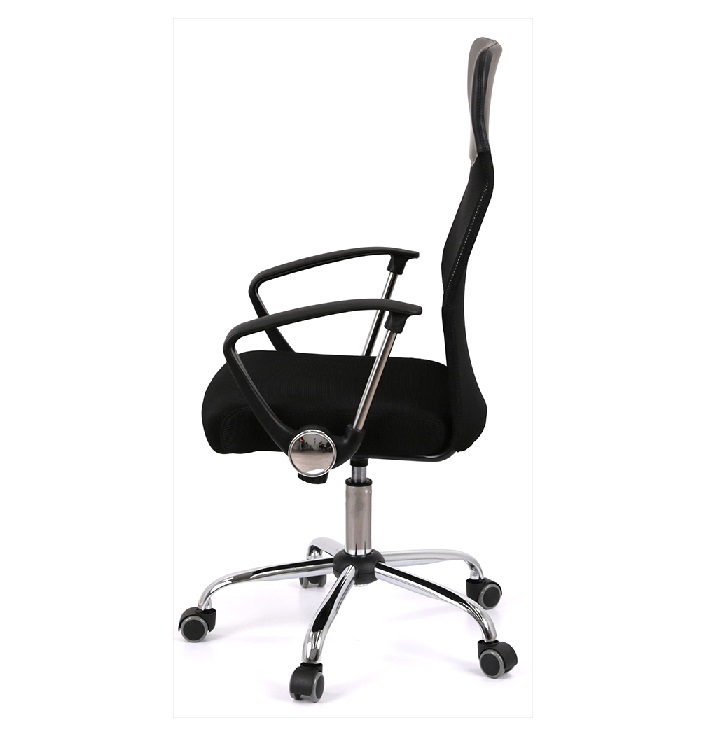 Подлокотники. У данной модели стильные комбинированные подлокотники из черного пластика и металлической трубы. Поверхность пластика текстурирована, благодаря чему руки не соскальзывают в процессе работы. Металлическая вставка гармонирует с хромированной крестовиной, создавая единственный неповторимый ансамбль. Высота подлокотников в нижнем положении сиденья кресла имеет высоту, которая позволяет засунуть кресло под рабочий стол для освобождения окружающего пространства.