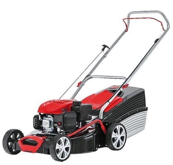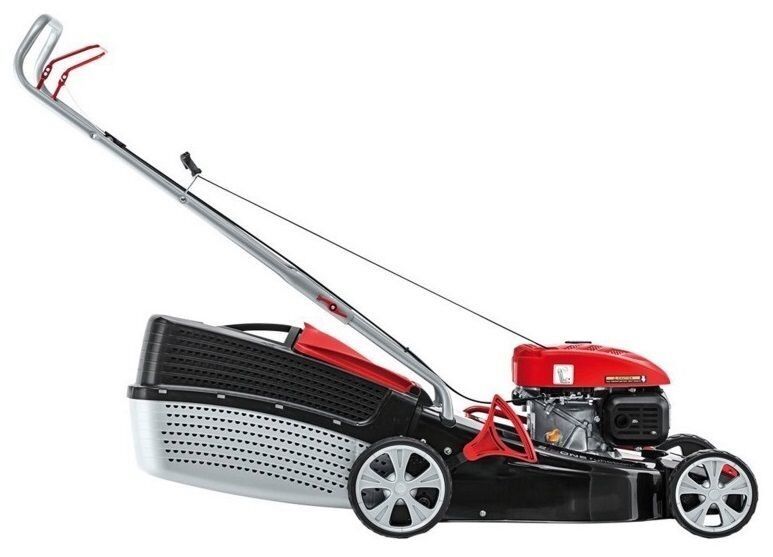 Для облегчения маневренности, газонокосилка имеет колеса различного размера с широким протектором. Передние диаметром 180 мм облегчают маневрирование и управление. Задние ведущие имеют диаметр 220 мм, что позволяет уверенно преодолевать подъемы, небольшие ямы и другие препятствия. Колеса устанавливаются в шарикоподшипниках, для увеличения срока службы. Корпус имеет специально разработанную заниженную и обтекаемую форму, чтобы легко добираться даже в труднодоступные места: под лавочки, столы и так далее. Для удобства управления газонокосилкой, все основные функции: ручка запуска, рычаги привода и включения ножа - выведены на регулируемую рабочую рукоять. Для удобства хранения, рукоять может складываться. Чтобы обеспечить удобный и уверенный захват, в верхней части имеются накладки из нескользящего прорезиненного материала, а сама рукоять легко регулируется под любой рост.