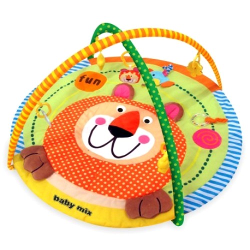 коврик оснащён двумя мягкими дугами с подвесными игрушками, безопасным зеркалом, а также игровыми развивающими элементами на поверхности коврика;