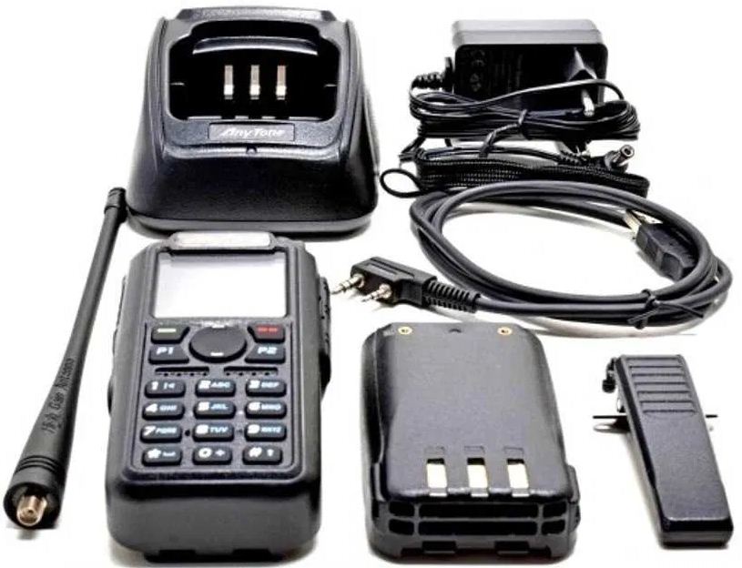 • USB/DC адаптер — це додатковий USB/DC кабель для рацій Anytone з конвертером напруги, який під'єднується до комплектного стакана рації (який спочатку працює тільки від мережі 220 V), і дає змогу заряджати її в польових умовах від будь-якого пристрої з USB-виходом, коли немає доступу до мережі 220 V (вхідна напруга USB: 5V, напруга на виході DC: 10V, струм: максимум 400-550 mA, довжина: 1 метр);