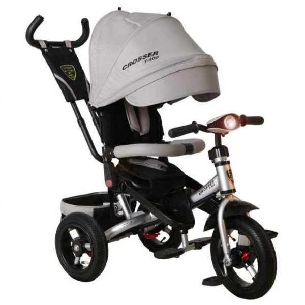 Трехколесный велосипед с надувными колесами Azimut Crosser Air T 400 с фарой и функциями прогулочной коляски предназначен для детей в возрасте от 9-ти месяцев до трех лет.