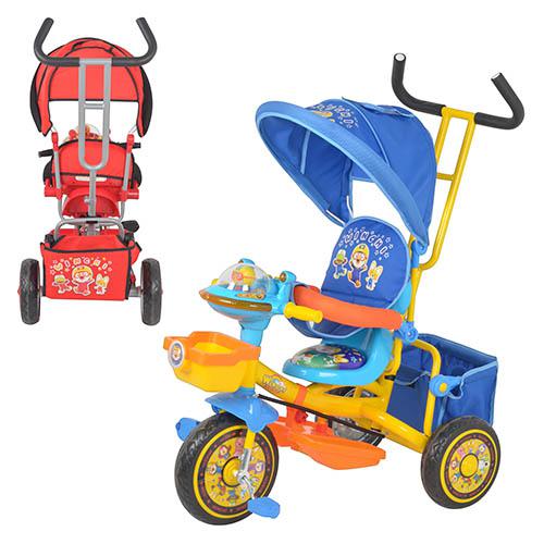 Отличной альтернативой прогулочной коляске летом может стать трехколесный велосипед. Для защиты от солнечных лучей и ветра предусмотрен козырек. Есть эргономичная родительская ручка. Сиденье комфортное со спинкой, есть подножка, для безопасности ребенка предусмотрен бампер. В корзину можно положить игрушки или пакеты. Переднее колесо большего диаметра, что обеспечит отличную проходимость. На руле есть панель со световыми эффектами и музыкой