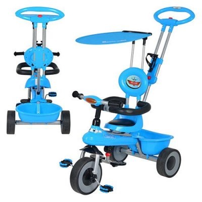 Трехколесный велосипед Bambi M 5366 с корпусом из высококачественной прочной пластмассы, регулируемой родительской ручкой. Сиденье для малыша комфортное с высокой спинкой и бампером для безопасности. Предусмотрена подставка под ножки, козырек, который защитит от солнца, и корзина, в которую можно положить игрушки или пакеты.