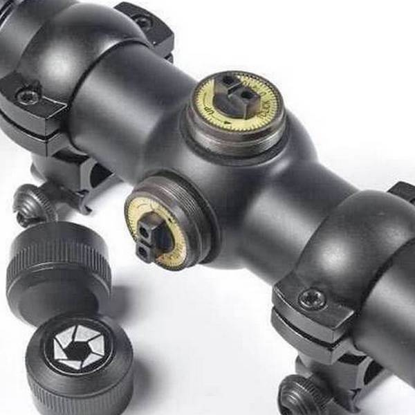 Под защитными алюминиевыми крышками находятся барабаны ввода поправок по вертикали и горизонтали. Барабаны имеют цену деления 0.25 МОА. Также конструкцией предусмотрена возможность калибровки барабанов для фиксации начальной точки ввода поправок на отметке "ноль".