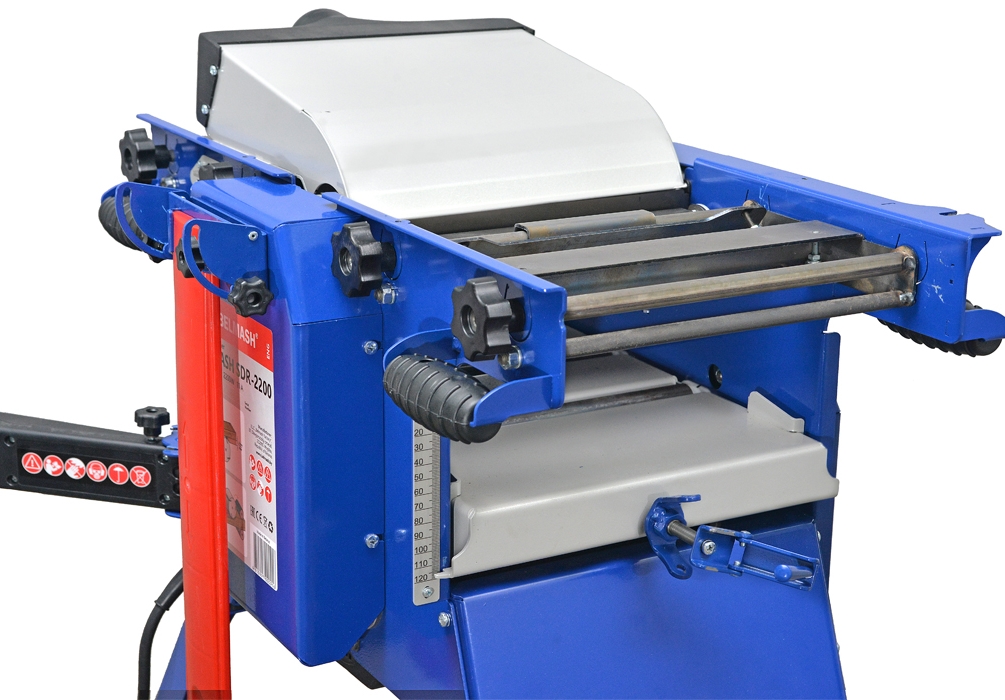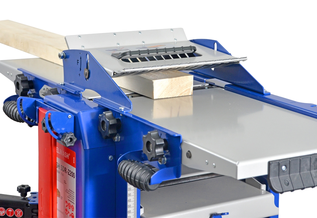 Ножевой вал SDR-2200 изготовлен из стали и имеет 3 заменяемых ножа (270 мм). Каждый нож крепится к валу при помощи винтов M6. В целях безопасности станки серии SDR оборудованы специальным блокирующим устройством, благодаря которому вы не сможете работать без установленного кожуха стружковыброса. Кнопка включения/выключения расположена на специальном поворотном кронштейне, который позволяет легко и быстро выключать станок во время любой операции. Все основные металлические части станка изготовлены из стали толщиной 2,5 мм, а столы из стали толщиной 3,5 мм. Это придает конструкции дополнительную жесткость, устойчивость и надежность.