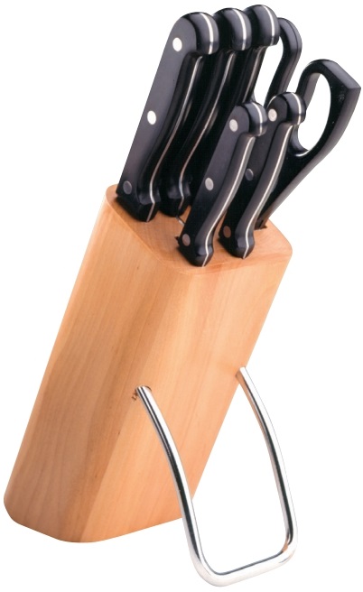 Эргономичные ручки обеспечивают безопасность и удобство работы. Ручки изготовлены из безвредного материала (фенол-альдегидного полимера). Традиционная заточка лезвий вручную. Стильная деревянная колода (из нетропического дерева) с нескользящей устойчивой платформой.