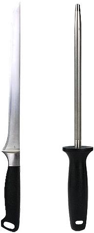 Лезвие ножа заточено вручную и долго сохраняет режущие свойства, эргономичная ручка обеспечивает безопасность и удобство работы, легко затачивается, упакован в пластиковый футляр гибкий нож для ветчины 25 см; мусат 20 см.