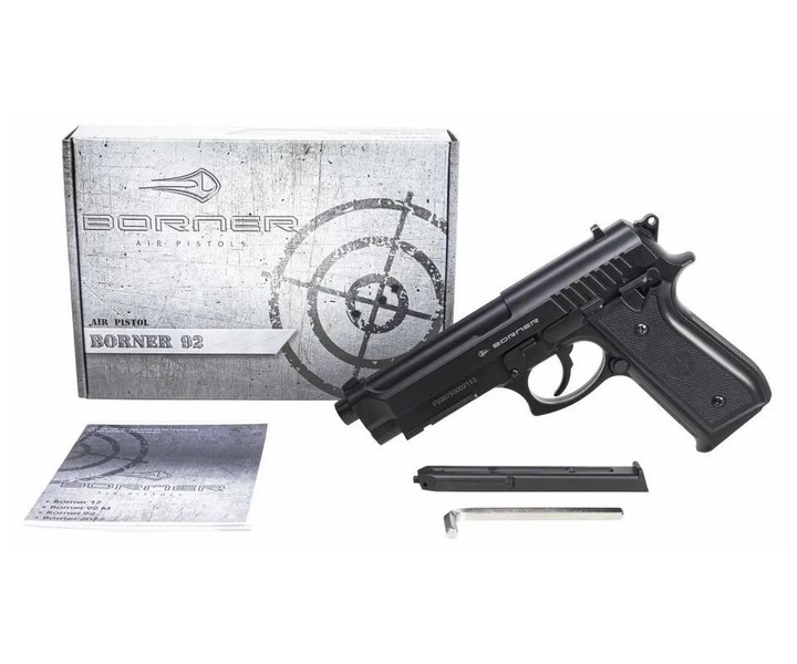 Пневматичний Borner має монолітний пластиковий корпус. Завдяки зниженню кількості рухомих вузлів виробник поліпшив купчастість і швидкість зброї - пістолет видає 120 метрів за секунду.