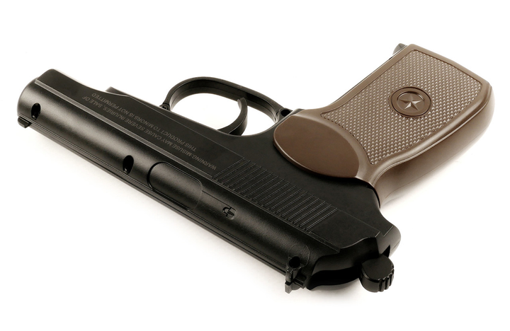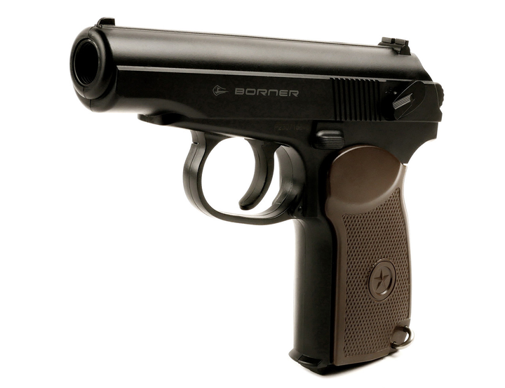 Пневматический пистолет Borner PM №1 имеет внешний вид пистолета Макарова, выполнен из пластика, что делает его легким – всего 365 грамм. Баллон для газа устанавливается в рукоять, для этого нужно сдвинуть накладку рукояти назад и проколоть баллон шестигранником, который идет в комплекте. Отличие от Borner PM-X заключается в наличии отдельного магазина из металла на 16 шариков. Спусковой механизм двойного действия, есть возможность стрелять как самовзводом, так и с предварительным взведением курка. Пистолет имеет неподвижную затворную раму. Ствол гладкий, выполнен из стали. Расход газа у Borner PM №1 невысокий, одного 12-граммового баллона хватает на более чем 70 выстрелов. Тип пневматики СО2; Калибр 4,5 мм; Ударно-спусковой механизм (УСМ) двойного действия; Общая длина 165 мм; Ствол гладкий; Материал затвора/рамы пластик; Материал рукояти пластик; Материал корпуса пластик; Вместимость магазина 16 шт; Начальная скорость 120 м/с; Прицельные приспособления нерегулируемый целик и мушка; Blowback нет; Предохранитель ручной; Вес 365 г; Комплектация пистолет, упаковка, шестигранный ключ, паспорт.