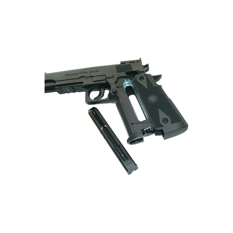 Потери газа при эксплуатации этой модели сведены к минимуму. Многозарядный металлический магазин и система подвижного ствола пистолета Borner Power Win 304 (Colt) обеспечивают надежную подачу шарика при выстреле, а легкий ход спускового крючка позволяет вести точную стрельбу на дистанции 10-15 метров. Материал основы/корпуса(рукояти): металл/пластик. Источник энергии: баллончик CO2, 12 гр.