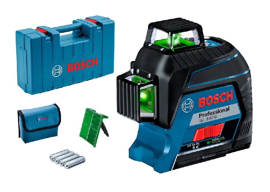 Линейный лазерный нивелир Bosch GLL 3-80 G излучает три широких луча зеленого цвета на 360 градусов. Длина луча до 30 м, с приемником — до 120 м. Точность нивелирования ±0,3 мм/м. Самонивелирование до ±4 градусов. Доставляется в чемодане для инструментов с батарейками, мишенью для отражения лучей и с футляром. В 4 раза лучше видимость лучей. Одновременное горизонтальное и вертикальное выравнивание на расстоянии до 30 м