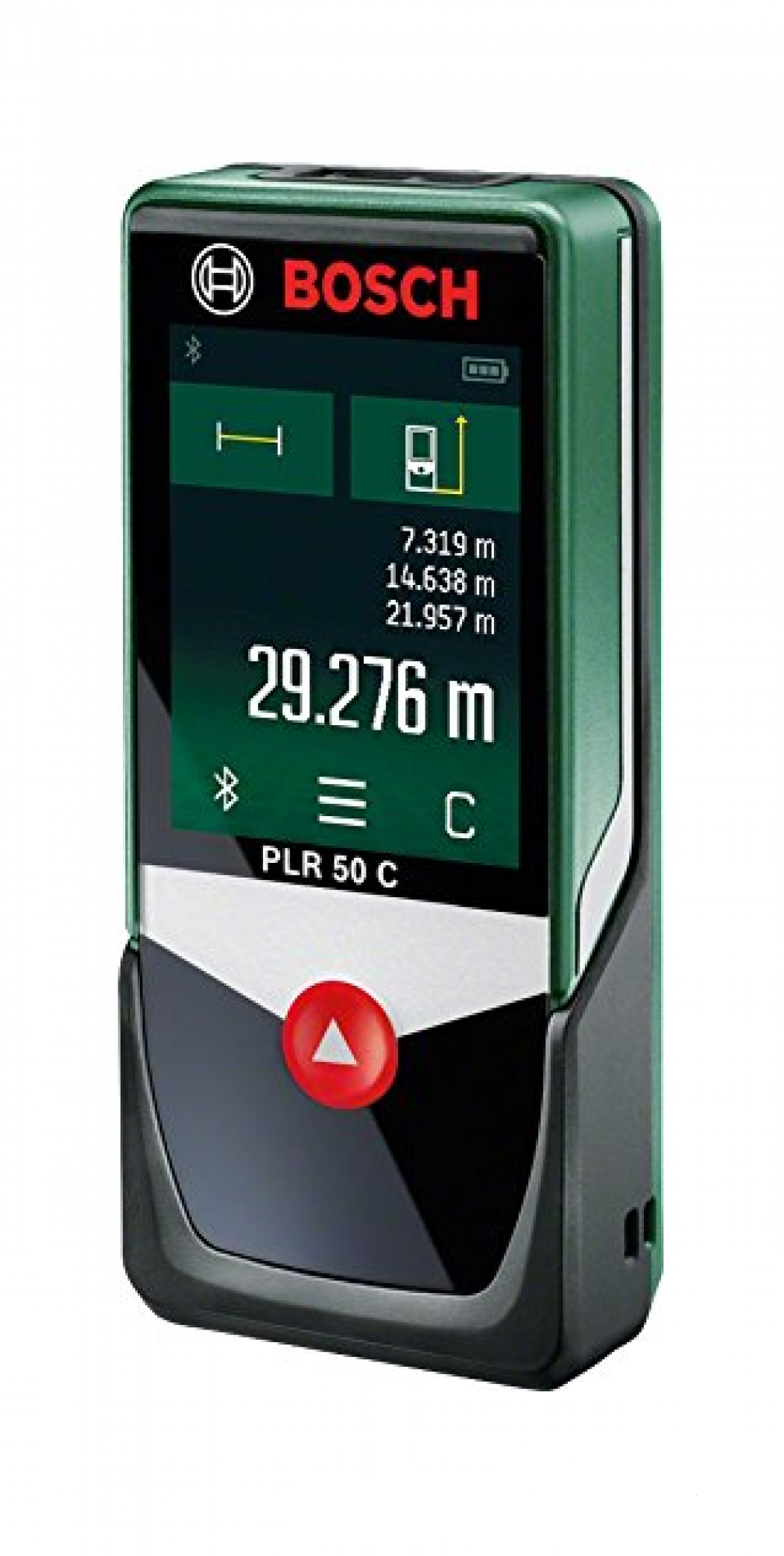 Достойная замена метру и рулетке — лазерный дальномер Bosch PLR 50 C — не только измерит расстояние от 0,05 до 50 м, но и вычислит площадь, объем, сложит и вычтет данные, измерит углы. Причем очень точно ± 2,0 мм и невероятно быстро (ему понадобиться от 0,5 до 4 секунд, чтобы выдать результат) Измерения можно проводить как от задней, так и от передней кромки. Кроме того, для определения углов наклона есть упорная плита. Хорошо читаемый цветной сенсорный экран четко отображает данные измерений. Полученные результаты можно тут же передать через Bluetooth.