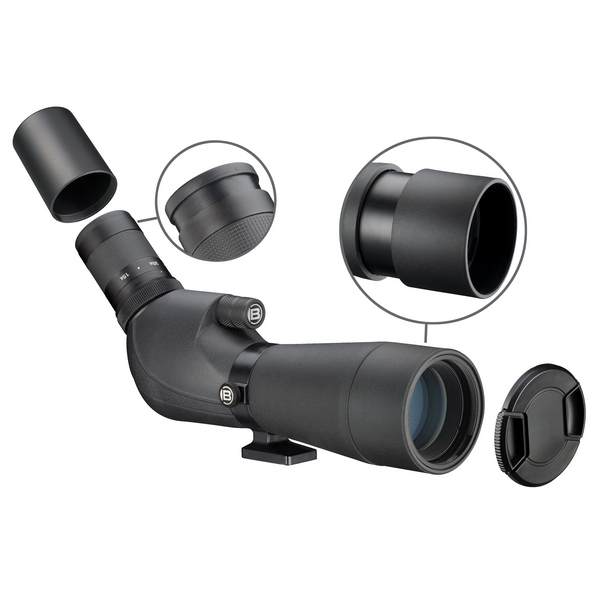 Фокусировка решена в виде маховичка небольшого диаметра, расположенного в центральном положении, что удобно для использования, независимо от того какой рукой проводить фокусировку. Для большего комфорта наблюдений применен поворотно-выдвижной наглазник. Выдвижная бленда обеспечивает надежную защиту и от солнечных бликов и от осадков. Крышки объектива и окуляра надежно фиксируются на своих местах и точно не потеряются во время движения.