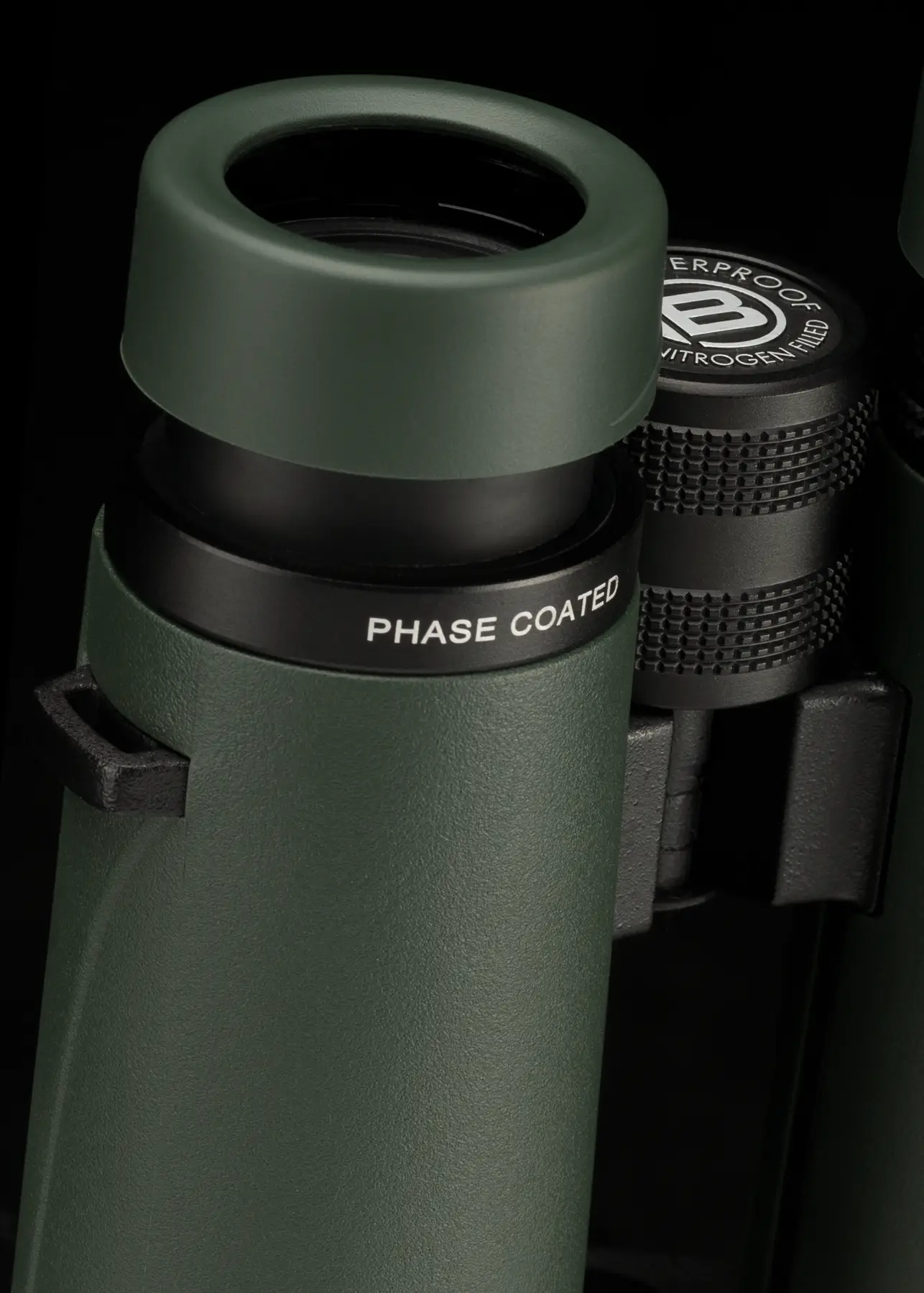 Компактний і універсальний бінокль Bresser Pirsch 10x34 WP Phase Coating (1721034) - відповідає всім сучасним високим вимогам та стандартам: повне багатошарове просвітлення лінз, захист від води та пилу, продутий азотом, призми з високоякісного оптичного скла BaK4. Корпус виконаний з легкого та міцного полікарбонату, вкритий гумовим покриттям з профільною накаткою, характеризується високою точністю підгонки всіх вузлів та складових компонентів. Конструкція корпусу з двома шарнірами і відкритим мостом, дозволяє зробити захват бінокля максимально надійним і зручним. Вся оптика Bresser Pirsch також має спеціальне покриття UR (Ultimate Reflection Coating), для покращення видимості в сутінках. Високоякісне спеціальне фазокоректуюче покриття (Phase Correction), яке наноситься на одну з поверхонь призменной обертової системи у вигляді найтонших шарів. Фазова корекція необхідна виключно для оптичної системи Roof, оскільки, проходячи через таку призму, світловий потік розкладається на два паралельні пучки світлових хвиль, виникає позафазове зміщення на половину довжини світлової хвилі, що призводить до зменшення роздільної здатності зображення, а також зниження контрастності. Phase Correction коригує це усунення. Як результат - зображення максимально чітке та контрастне. Вартість такого покриття досить висока, а процес нанесення вимагає прецизійної точності, тому таке технологічне ускладнення можуть дозволити собі лише відомі виробники оптики.