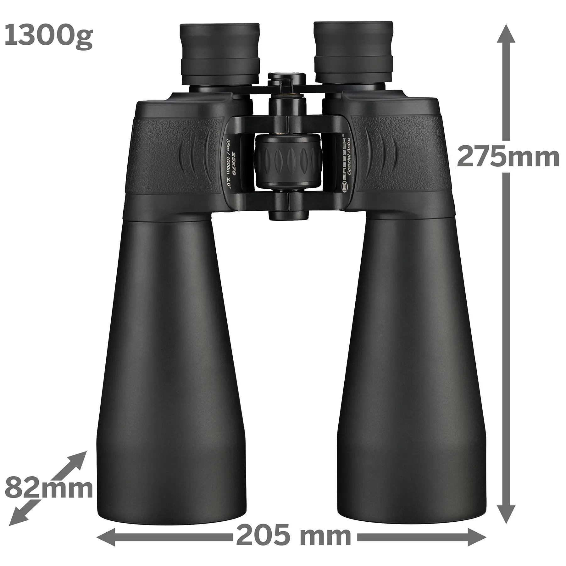 Лінійка астрономічних біноклів Bresser поповнилася недорогою моделлю Spezial-Astro 25x70, яка відповідає всім базовим вимогам до астрономічних приладів. 70-мм об'єктив збирає достатню кількість світла для спостережень подвійних зірок, зоряних скупчень і планетарних спостережень. Завдяки великому 25-кратному збільшенню та можливості установки на штатив, дана модель буде ідеальним варіантом для стаціонарних ландшафтних спостережень, спостережень міських пам'яток, спостережень за міграцією птахів або рухом суден на море на відстані від двох кілометрів та більше.