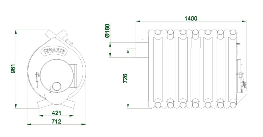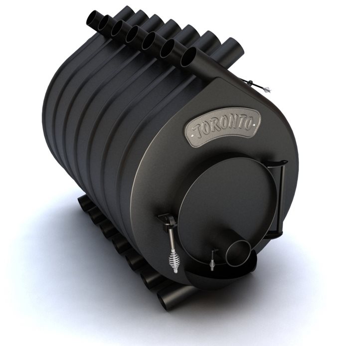 Булерьян Новаслав Toronto тип 04 работает на твердом топливе — дровах, древесных отходах, торфе, брикетах и т. п. Может быть использована, как источник тепла в жилом или производственном помещении. Принцип работы как в газогенераторе — тлеющее горение. Сконструирован таким образом, что за счет конвекции самостоятельно смешивает воздух по всему объему. Через трубки снизу засасывается холодный воздух, а через ряд верхних труб выбрасывается воздух подогретый до 60-80 градусов. Не смотря на это температура поверхности самой печки остается весьма низкой, никогда не раскаляется. Отличается своей экономичностью, за счет сжигания топлива в два этапа. Первая камера предназначена для процесса тления и образования печных газов, вторая для сжигания газов благодаря подаче вторичного воздуха через специальные форсунки. Происходит полное сгорание и КПД 70-75%. На полной загрузке печь способна проработать 8-12 часов. Работает без присмотра. Пожаробезопасность обеспечена герметически закрываемой дверцей и низкой температурой поверхности. При установке в жилых помещениях её можно отделать в виде камина и вывести монтаж воздушного отопления по всему помещению.