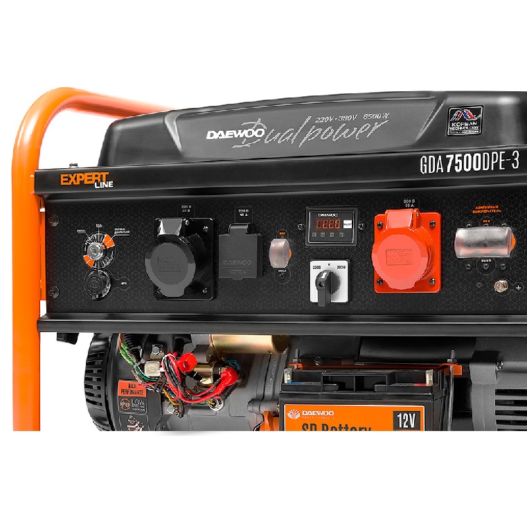 Генератор бензиновий DAEWOO GDA-7500DPE-3 6,5 кВт - трифазна 400 В та однофазна 230 В електростанція для забезпечення електроживлення на будівельних майданчиках, в офісах, будинках. Дозволяє підключати електроприлад сумарною потужністю до 6 кВт (номінальна потужність при напрузі 400В і 230 В). Максимальна потужність даного генератора (для короткострокових навантажень при напрузі 400В та 230В) – 6,5 кВт.
