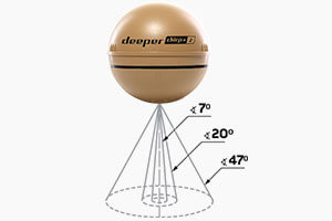 Завдяки 3 частотам променів ехолота Deeper Chirp+ 2 ви зможете швидше знаходити місця, де тримається риба, скануючи ділянку широким променем під кутом 47° (100 кГц). Використовуйте середній кут променя 20° (240 кГц), щоб детальніше дослідити знайдену вами точку, або зосередьтеся на цільових видах за допомогою дуже детального вузького променя 7° (675 кГц).