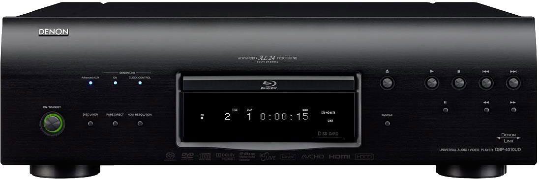 Помимо воспроизведения Blu-ray дисков DBP-4010UD может проигрывать обычные DVD, Super Audio CD, DVD-Audio и CD. Плеер Denon DBP-4010UD имеет порт Ethernet, благодаря которому можно обновлять программное обеспечение устройства. В DBP-4010UD также предусмотрен карт-ридер. Среди плеером Denon поддерживаемых форматов файлов - AVCHD, DivX, JPEG, MP3, WMA, AAC и WAV.
