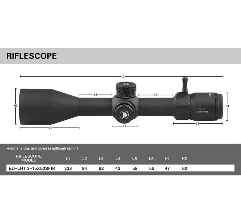 Діаметр об'єктива становить 50 мм, що забезпечує відмінну світлопропускну здатність та забезпечує яскраве зображення навіть в умовах низького освітлення. Крім того, приціл ED-LHT 3-15x50 SFIR оснащений системою сферичного фокусування (SFIR), що дозволяє швидко та точно змінювати фокусну відстань та зберігати чіткість зображення на будь-якій відстані.